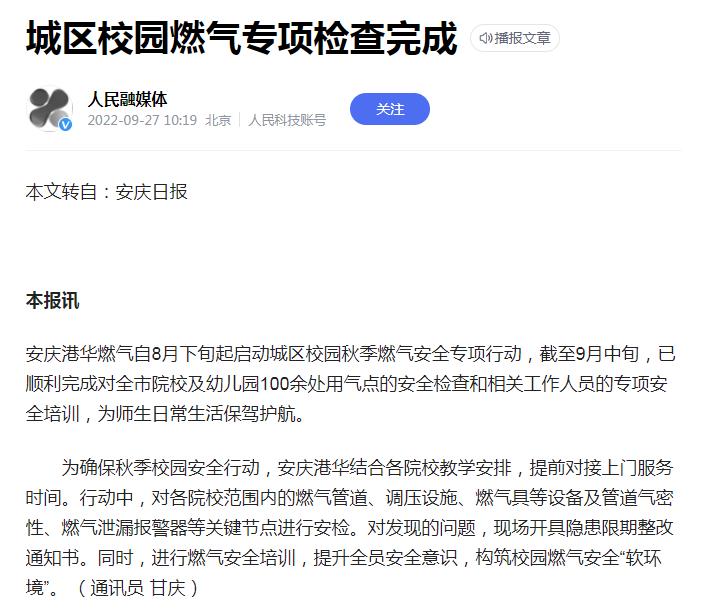 城區(qū)校園燃?xì)鈱m棛z查完成(轉(zhuǎn)載于人民網(wǎng)融媒體)
