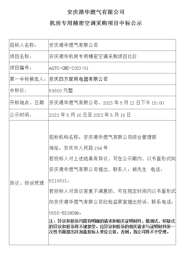 安慶港華燃?xì)庥邢薰緳C(jī)房專用精密空調(diào)采購(gòu)項(xiàng)目中標(biāo)公示