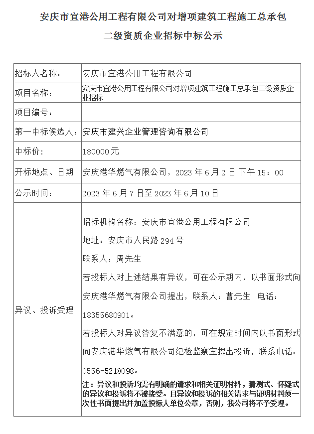 安慶市宜港公用工程有限公司對增項(xiàng)建筑工程施工總承包二級資質(zhì)企業(yè)招標(biāo)中標(biāo)公示