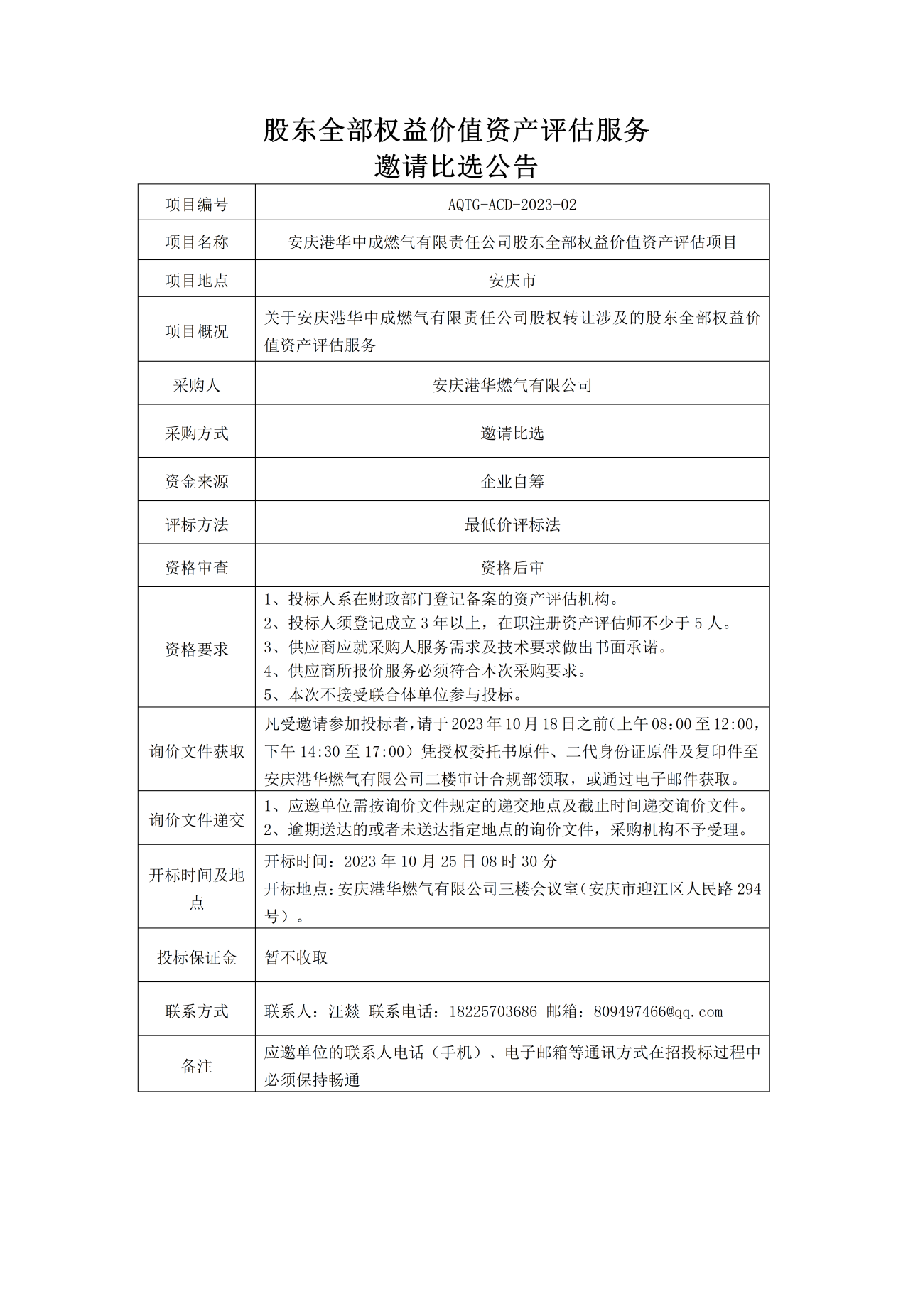 安慶港華中成燃氣有限公司股東全部權(quán)益資產(chǎn)評估服務(wù)邀請比選公告