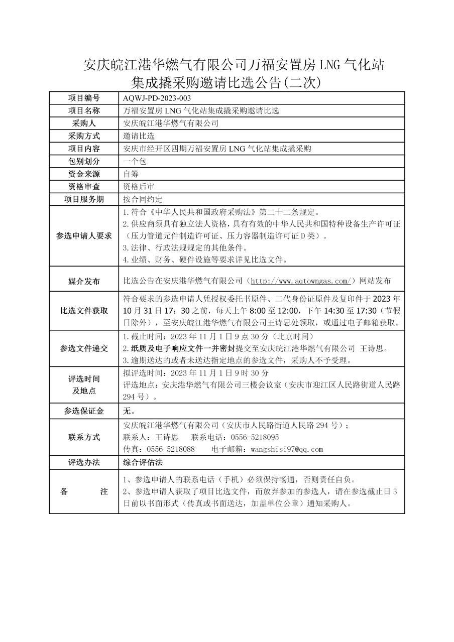 安慶皖江港華燃?xì)庥邢薰救f福安置房LNG氣化站集成撬采購邀請(qǐng)比選公告(二次)