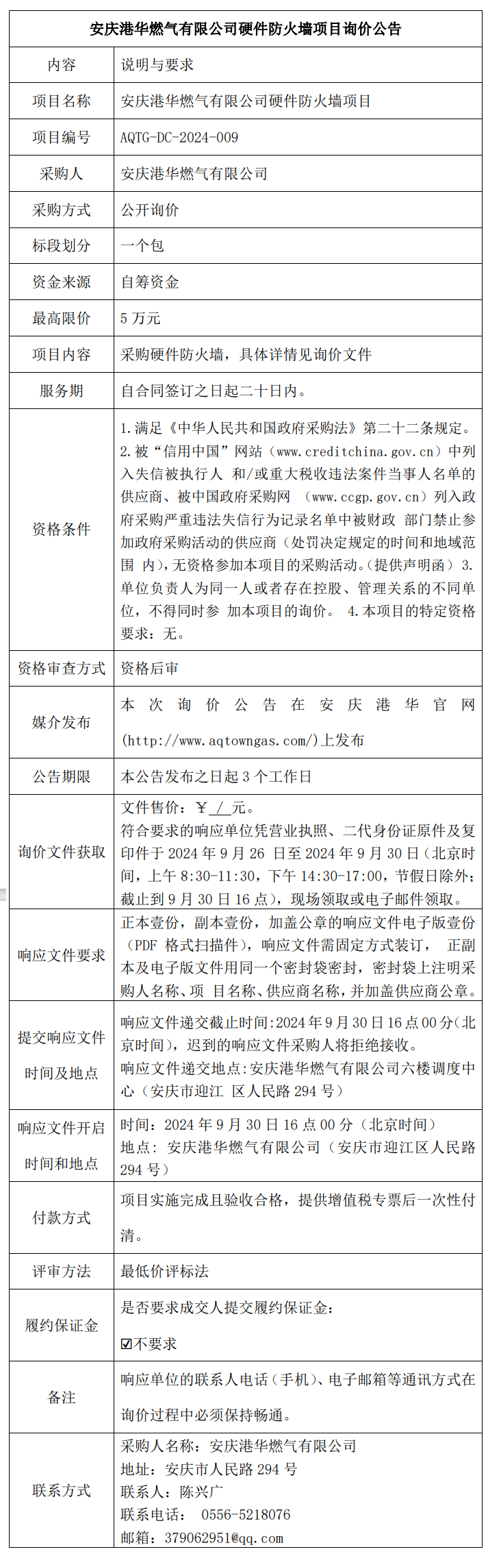 安慶港華燃氣有限公司硬件防火墻項目詢價公告