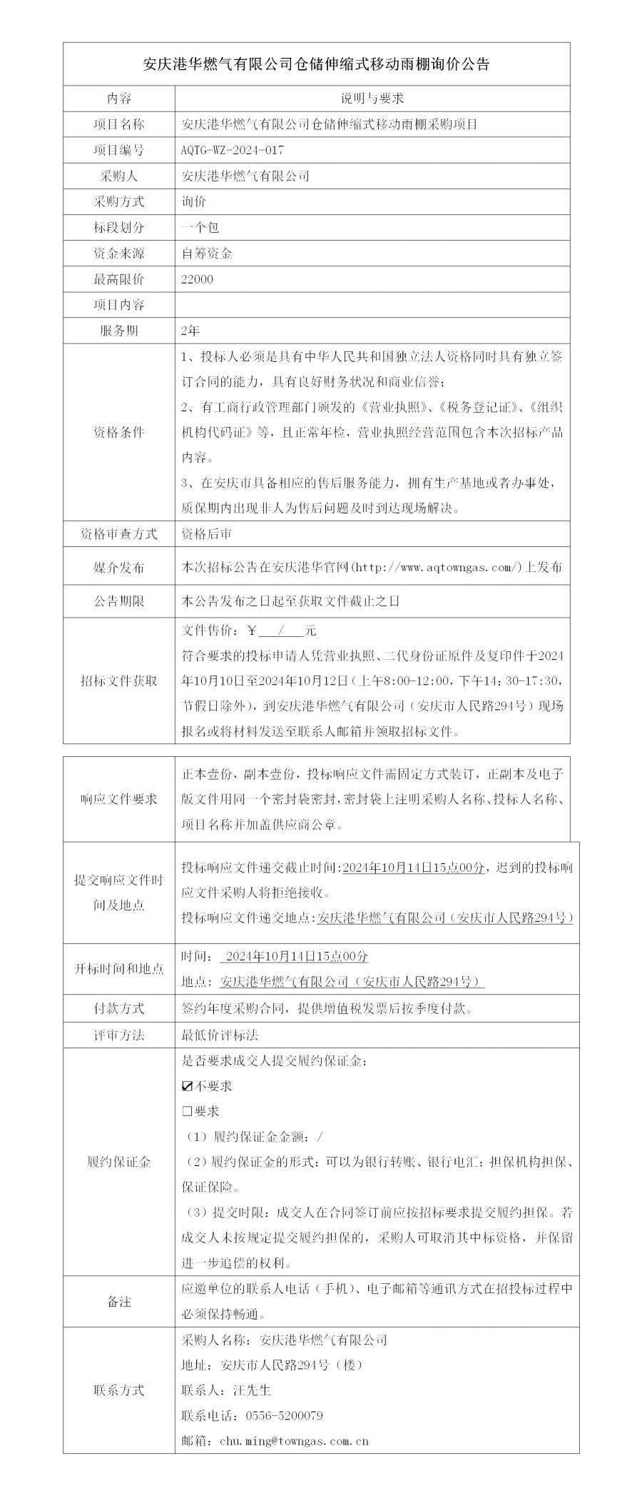 安慶港華燃?xì)庥邢薰緜}(cāng)儲(chǔ)伸縮式移動(dòng)雨棚詢價(jià)公告