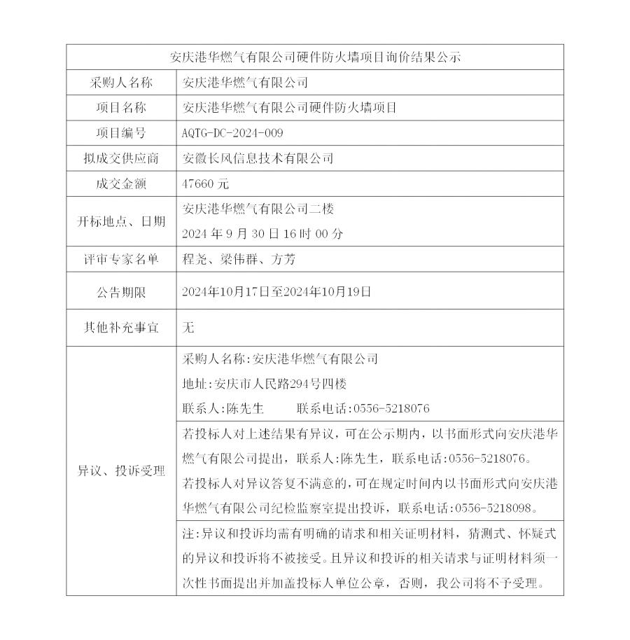 安慶港華燃?xì)庥邢薰居布阑饓?xiàng)目詢價(jià)結(jié)果公示
