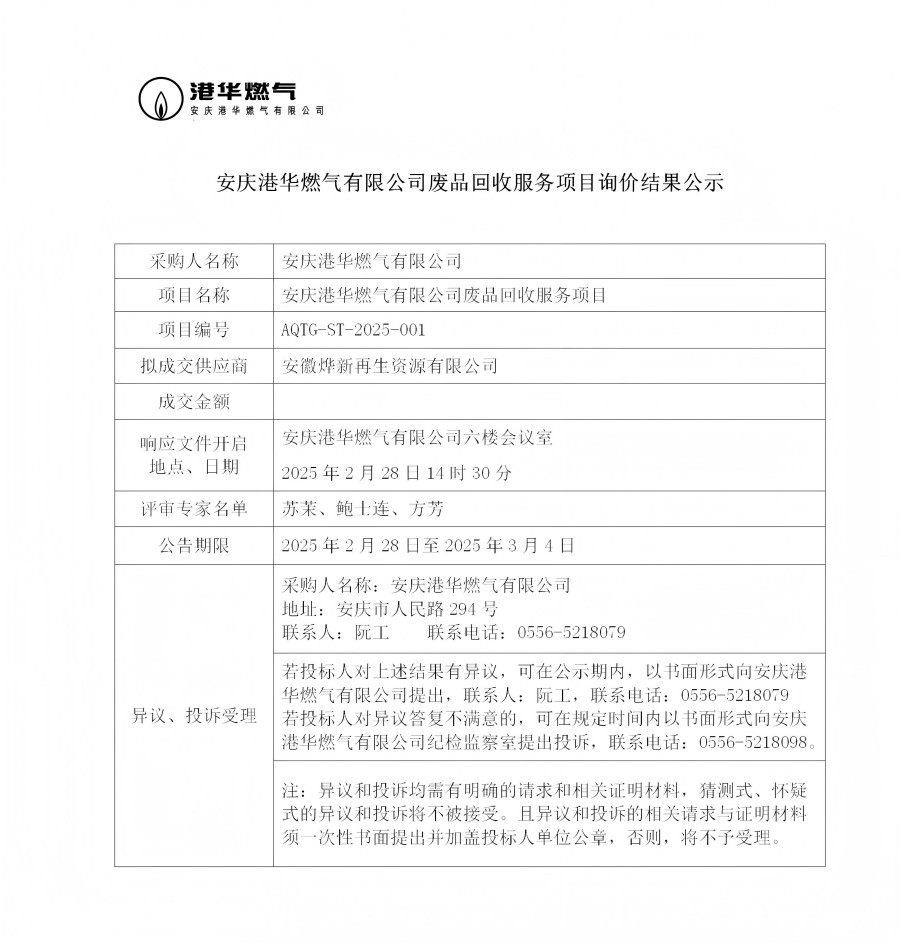 安慶港華燃?xì)庥邢薰緩U品回收服務(wù)項目詢價結(jié)果公示