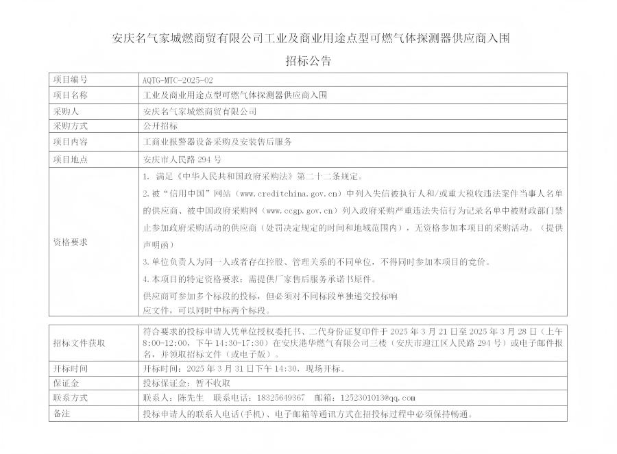 安慶名氣家城燃商貿(mào)有限公司工業(yè)及商業(yè)用途點型可燃氣體探測器供應商入圍招標公告