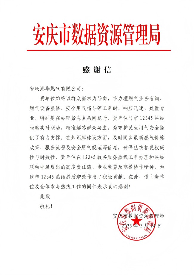 3月24日,安慶市數(shù)據(jù)資源管理局向安慶港華發(fā)來感謝信,對我司2024年燃?xì)鉄峋€問題辦理的工作成效給予充分肯定。