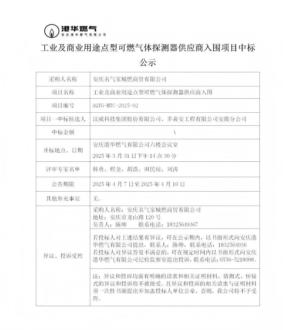 工業(yè)及商業(yè)用途點(diǎn)型可燃?xì)怏w探測器供應(yīng)商入圍項目中標(biāo)公示
