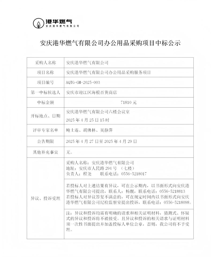 安慶港華燃?xì)庥邢薰巨k公用品采購項目中標(biāo)公示
