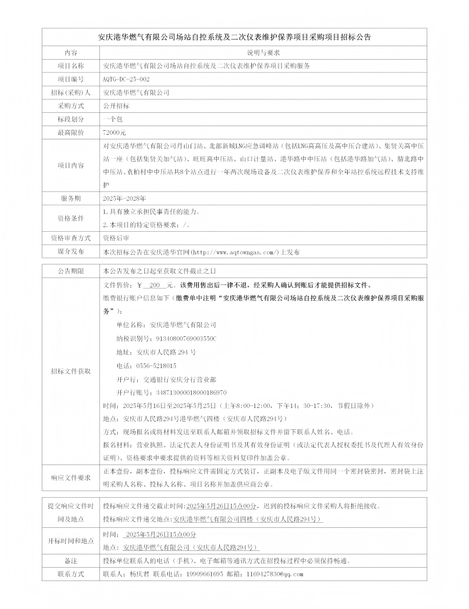 安慶港華燃?xì)庥邢薰緢?chǎng)站自控系統(tǒng)及二次儀表維護(hù)保養(yǎng)項(xiàng)目采購(gòu)項(xiàng)目招標(biāo)公告