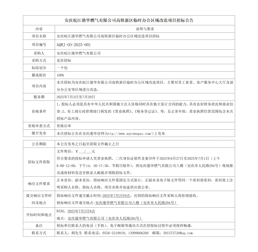 安慶皖江港華燃?xì)庥邢薰靖哞F新區(qū)臨時(shí)辦公區(qū)域改造項(xiàng)目招標(biāo)公告