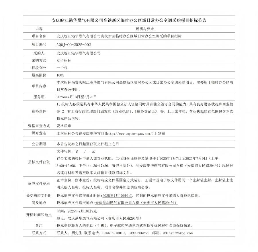 安慶皖江港華燃?xì)庥邢薰靖哞F新區(qū)臨時辦公區(qū)域日常辦公空調(diào)采購項(xiàng)目招標(biāo)公告