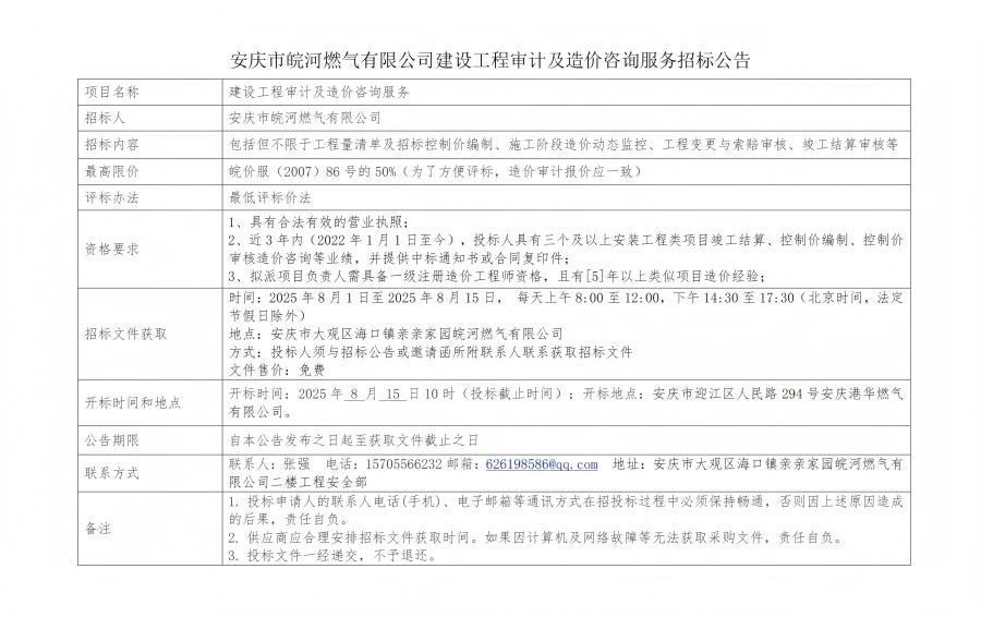 安慶市皖河燃?xì)庥邢薰窘ㄔO(shè)工程審計(jì)及造價(jià)咨詢服務(wù)招標(biāo)公告