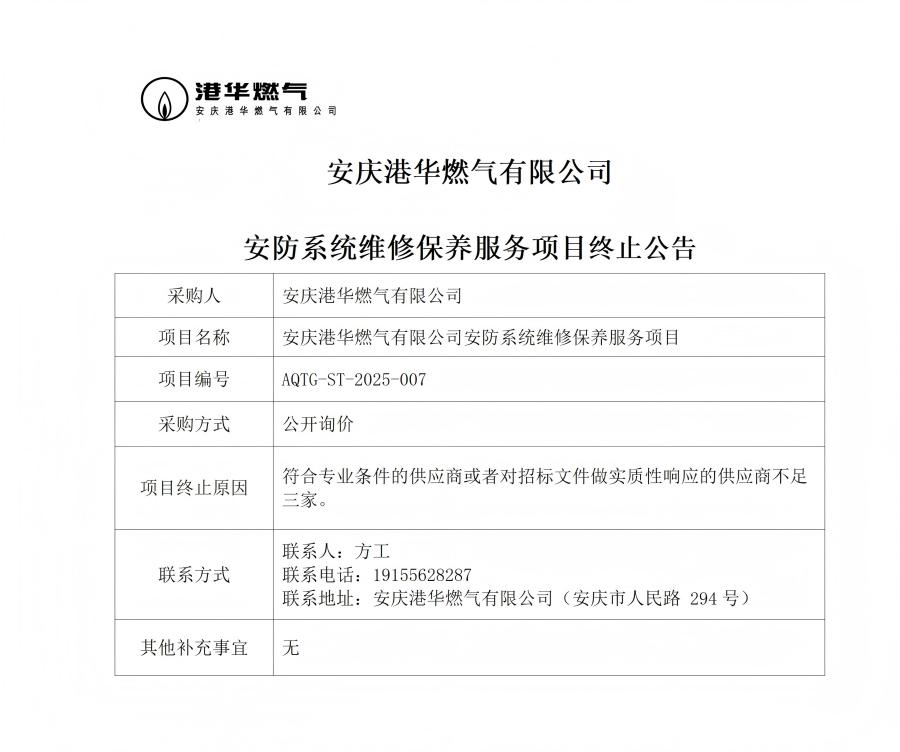 安慶港華燃氣有限公司安防系統(tǒng)維修保養(yǎng)服務項目終止公告