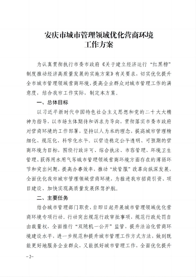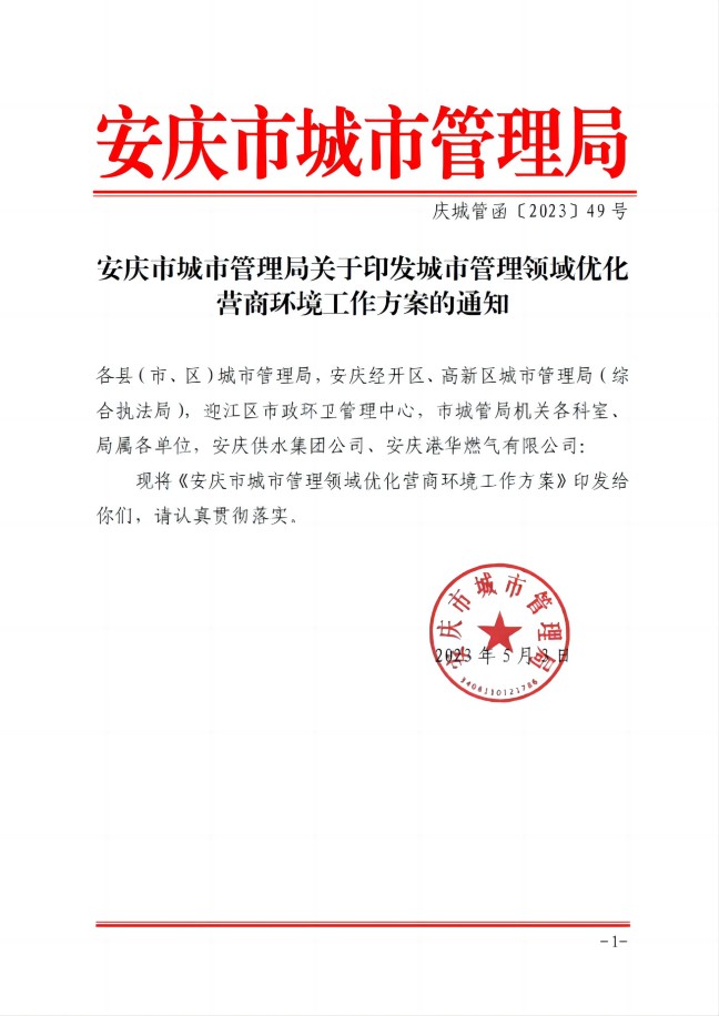 安慶市城市管理局關(guān)于印發(fā)城市管理領(lǐng)域優(yōu)化營商環(huán)境工作方案的通知